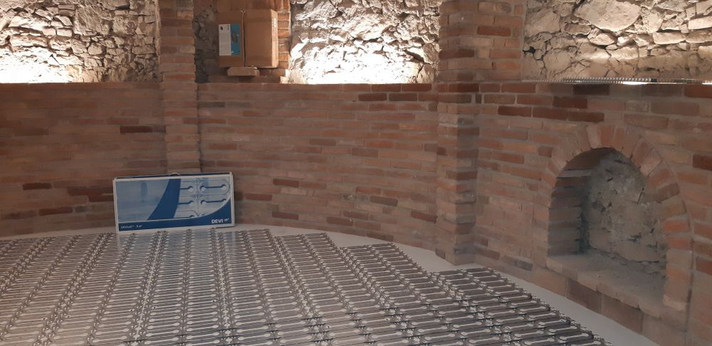 Elektrické podlahové kúrenie DEVI v severnej bašte Smolenického zámku. Použili sme suchú montáž pomocou systému Devicell na odizolovanie pôvodnej kamennej podlahy. Zvýšili sme tak dynamiku kúrenia a obmedzili teplotné straty do podlahy.
